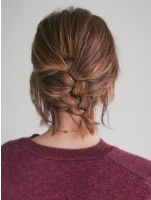 ポイントは、毛先をバラバラに散らしてあげると華やかさがアップします。しっかりスプレーでとめましょう。ゆるく作った編み込みもエレガントさを引き立てます。