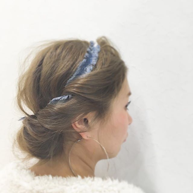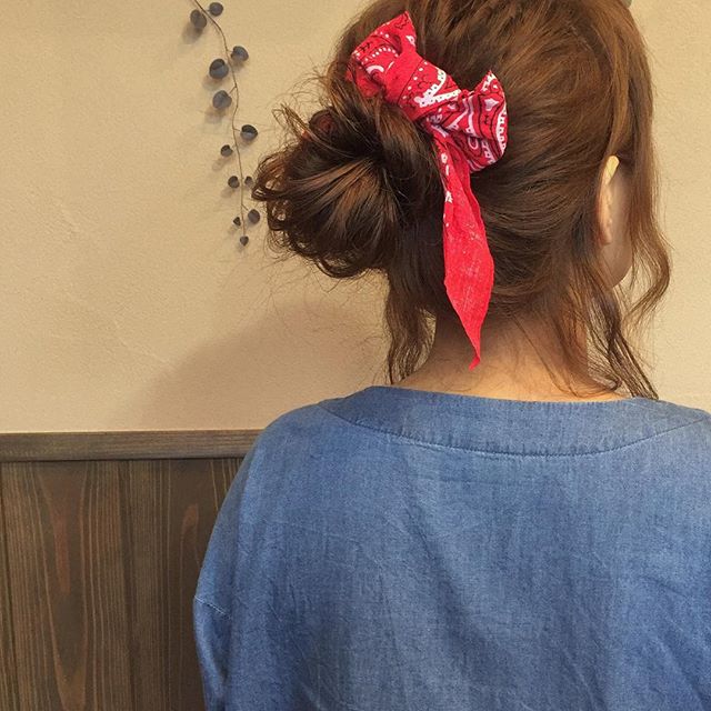 シニヨンにバンダナを巻いたアレンジ。